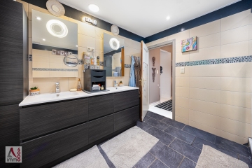 4 marches mènent vers un premier demi-niveau avec un spacieux hall de nuit de 6m², un wc indépendant, une salle de bains de 3,3 x 3,2m avec baignoire, douche, double éviers et meubles, un bureau de 2,41 x 2,04m. Ce demi-niveau ouvre également sur deux chambres, une de 4 x 4,1m, et une de 4,1 x 3,54m + son dressing de 2,68 +2,5m.