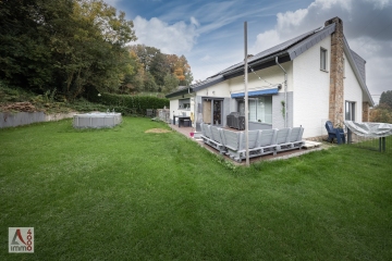 La parcelle de 1021 m² est orientée au sud, elle est délimitée par des haies hautes sur les côtés tandis que le fond est protégé par une butte boisée. Terrasse donnant un accès direct à la cuisine.