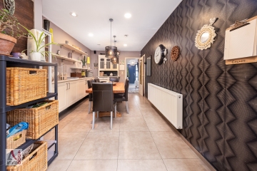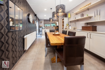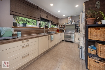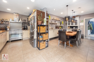 REZ : Hall d'entrée 4,9 x 1,95, living de 9 x 3,8 + 3,93 x 0,8m (plus de 37 m²), cuisine équipée de 5 x 2,7m ouverte sur une salle-à-manger de 4,35 x 3m. La cuisine dispose d'une hotte, d'un double évier, d'une cuisinière 6 becs au gaz de ville, d'un lave-vaisselle et d'un micro-ondes.