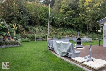 La parcelle de 1021 m² est orientée au sud, elle est délimitée par des haies hautes sur les côtés tandis que le fond est protégé par une butte boisée. Terrasse donnant un accès direct à la cuisine.